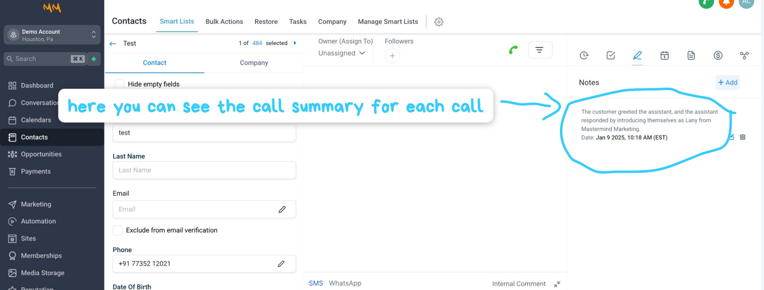 Learn how to view call summaries for contacts in GoHighLevel (GHL).